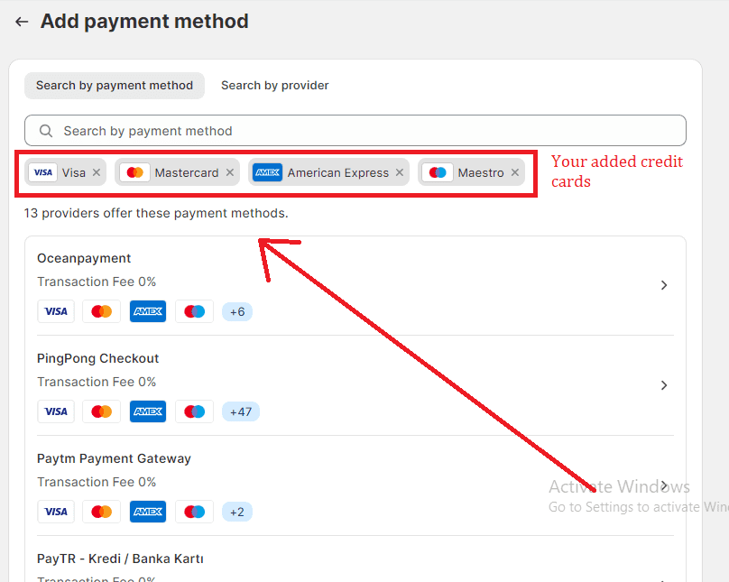 So, these credit cards will be showcased on the add payment method page, along with the list of the providers offering your selected credit card payment options.