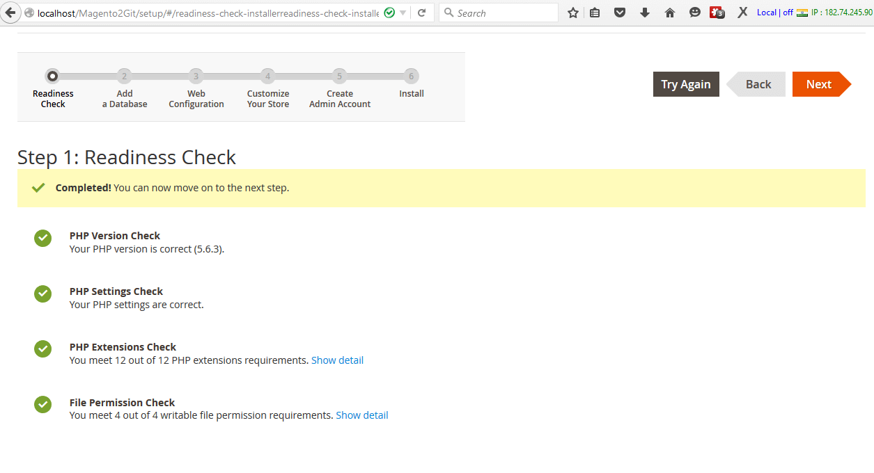 - It will start Readiness Check, like php version, php settings check, Php extensions check, File permission check.