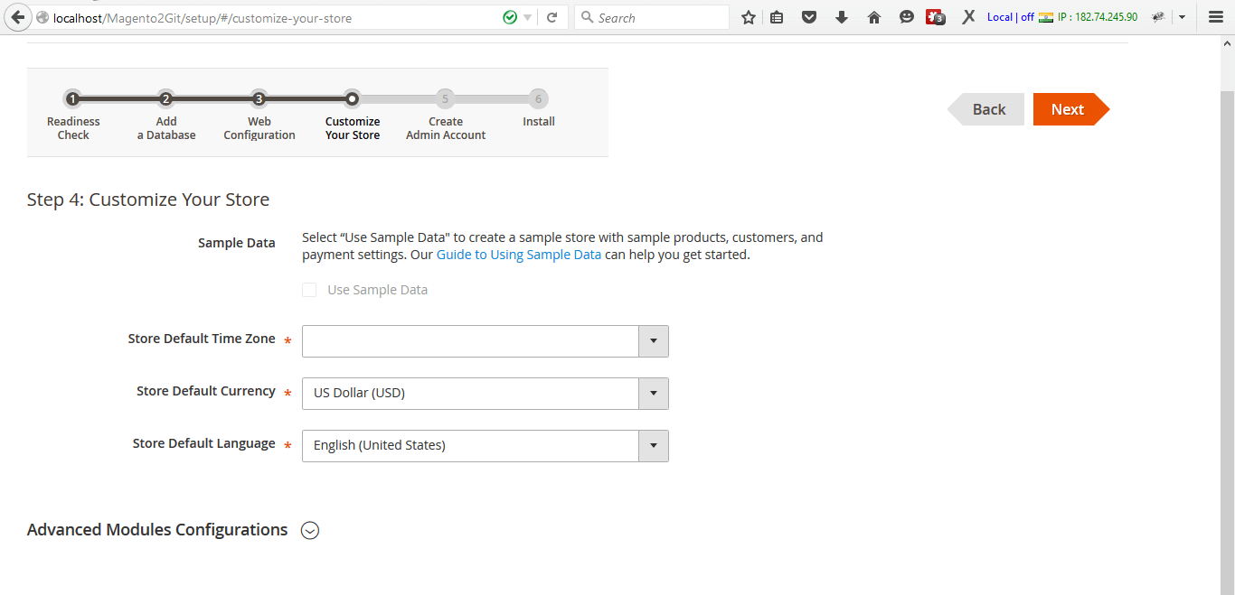 - If you have already donloaded sample data then this screen will show the option. Set default time zone and click on Next.