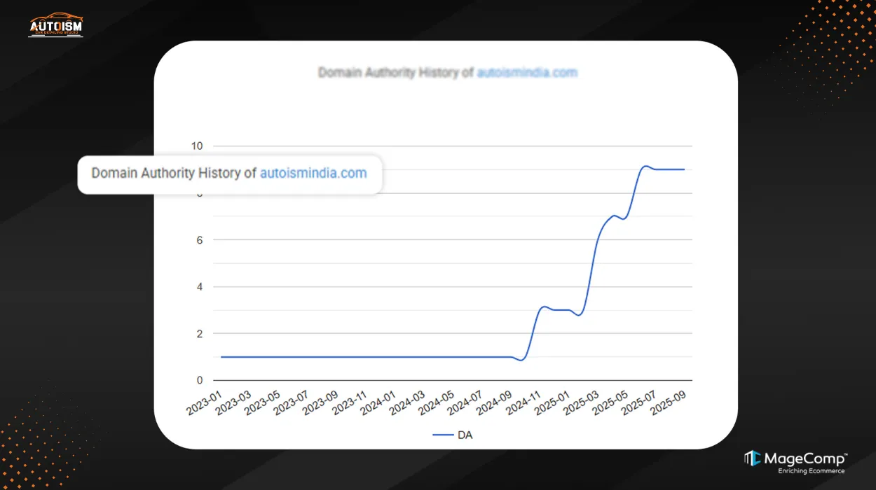 The spam score ultimately dropped to 0 with the ongoing acquisition of backlinks, while the domain’s DA improved to 9 and PA jumped to 22. As a result, Autoism has reestablished itself as a more trustworthy domain for search engines.