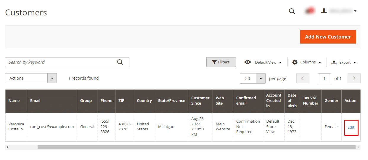 Step 3: Find the customer from the grid and click Edit in the action column.