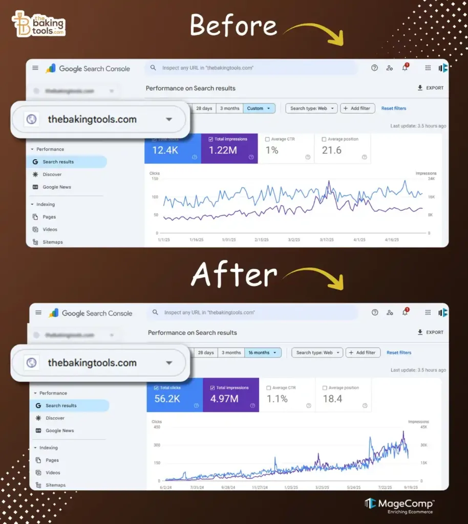 MageComp developed and implemented a comprehensive and regular content marketing plan, producing regular blog posts on baking trends, products, and guidebooks for educational content. This increased keyword rankings and improved the overall authority of the brand in the baking niche.